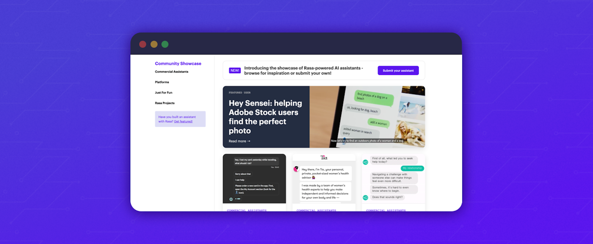 We launched our new Community Showcase to highlight the range of projects built with Rasa and to help developers get inspired by what's possible. We've included 20+ AI assistants in this first version of our showcase, representing both commercial and personal projects.