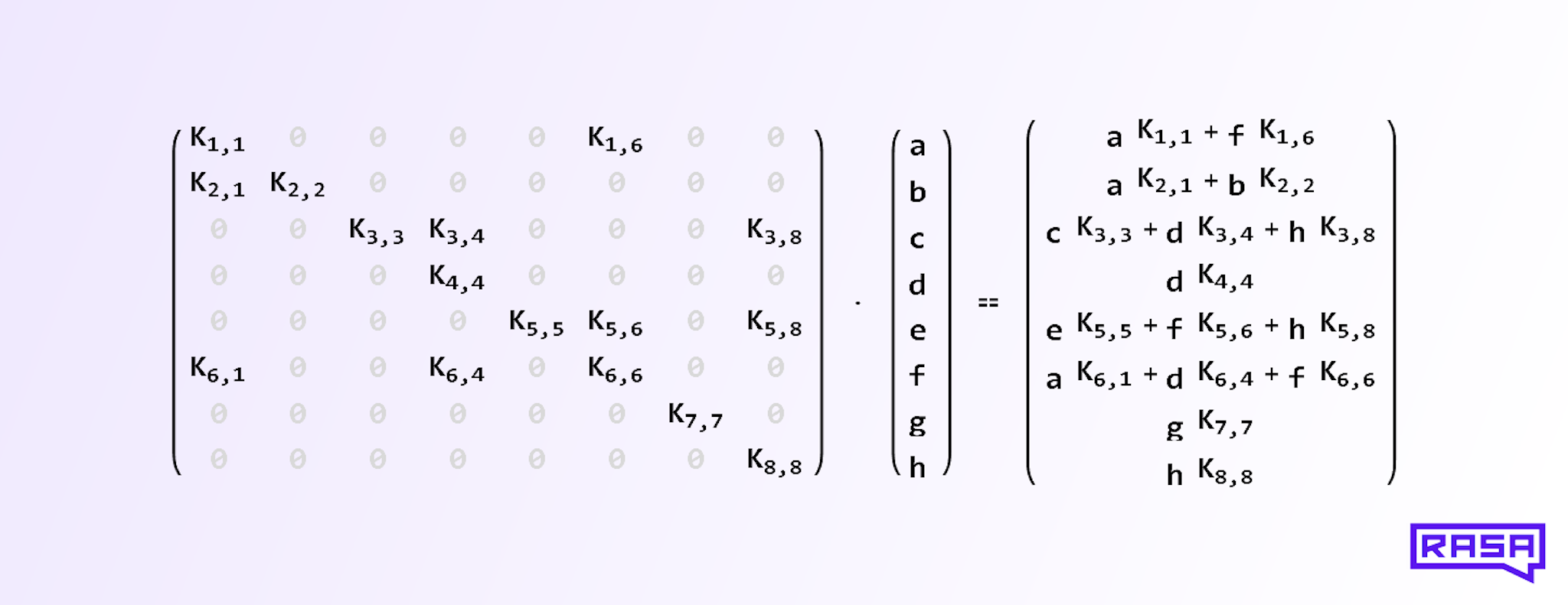 The 8x8 kernel matrix on the left contains 16 = 0.25 * 8^2 random entries. Each output on the right hand side therefore contains a linear combination of some of the input vector entries a, b, c, and so on. Which entries enter this linear combination is random, because we choose the position of the zeros in each row of the kernel matrix at random during initialization (except the diagonal, which guarantees that at least one input is connected to each output and vice versa).
