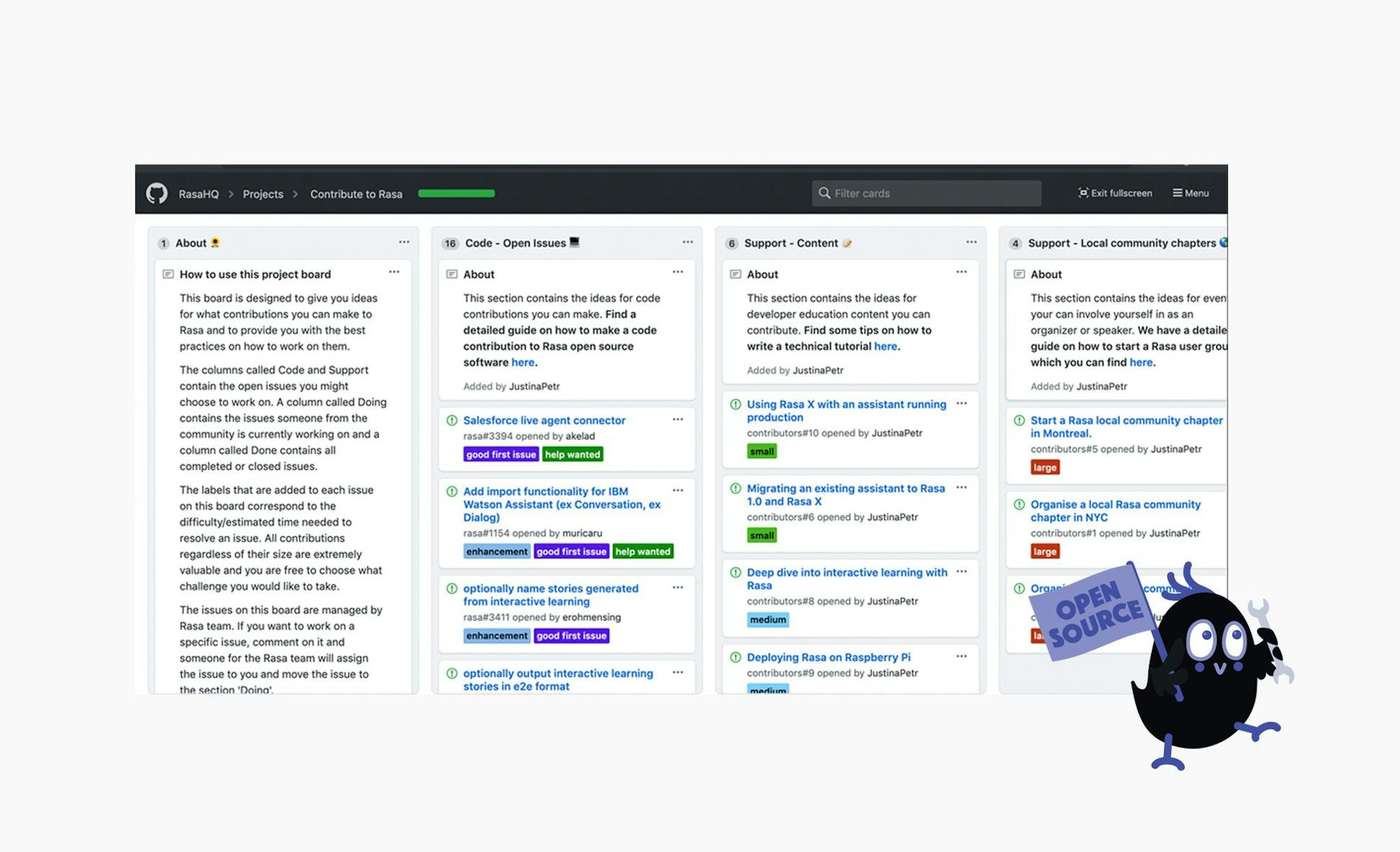 It's an early stage of this project and more contribution ideas will be added as the time goes by. We hope that with time, this project board will grow into a Rasa community roadmap and make it so much easier for you to become a contributor to Rasa open source project.